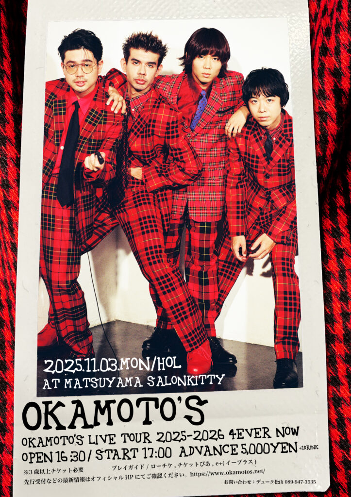 11/3 (月)OKAMOTO’Sサロンキティ, スケジュール11/3 (月)松山SALONKITTYOKAMOTO’S 「OKAMOTO’S LIVE TOUR 2025-2026 4EVER NOW」開場16:30/開演17:00 チケット前売 スタンディング¥5,000(1d別) 入場条件 ※3歳以上チケット必要■プレイガイド ローチケ チケットぴあ e+(イープラス)▼先行受付などの最新情報はオフィシャルHPにてご確認ください▼ https://www.okamotos.net/ Post Share RSSPost navigation 前の記事次の記事