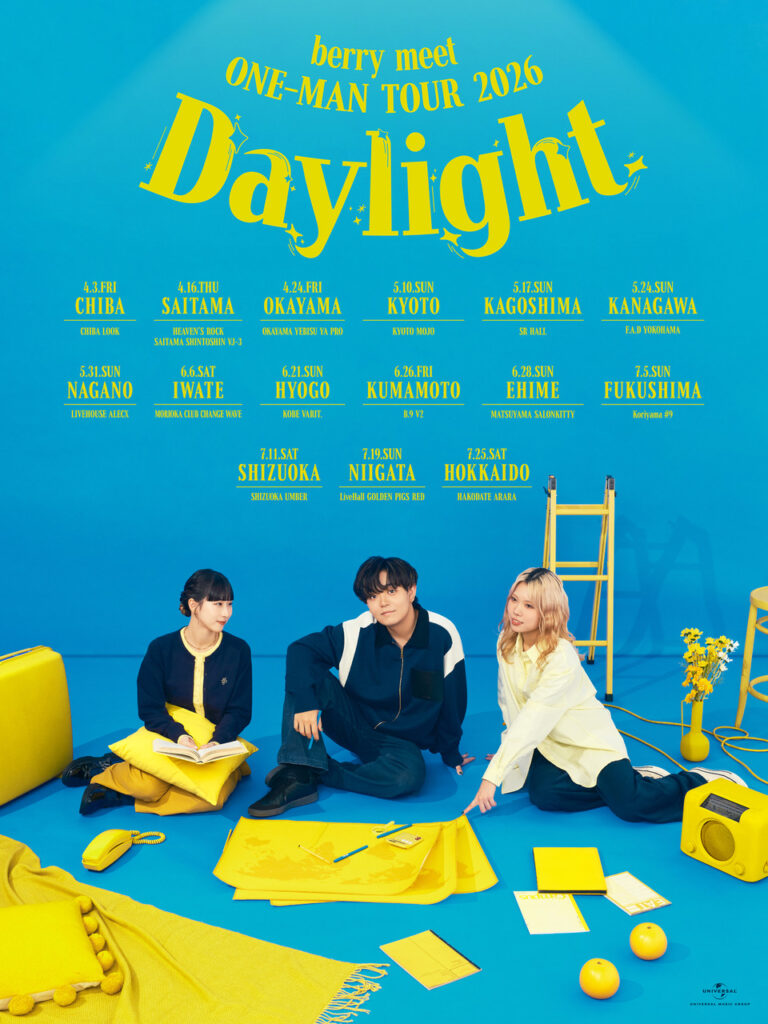 berry meet TOUR 2026 「Daylight」 2026/6/28 開場17:30 - 開演18:006/28(日)松山SALONKITTYberry meet TOUR 2026 「Daylight」開場17:30/開演18:00 オールスタンディング5,000円(税込) ※別途ドリンク代必要 ※未就学児入場不可■チケットプレイガイド イープラス【問い合わせ】DUKE(松山)089-947-3535カレンダーに戻るiCal • Google カレンダー Post Share RSSPost navigation“The Great “Tatsuaki” Syndrome” THE DEAD P☆P STARS / 13-thirteen- / Dunexxxx / RODEO FIXER / MONGOLIAN BARBECUES 2026/6/13